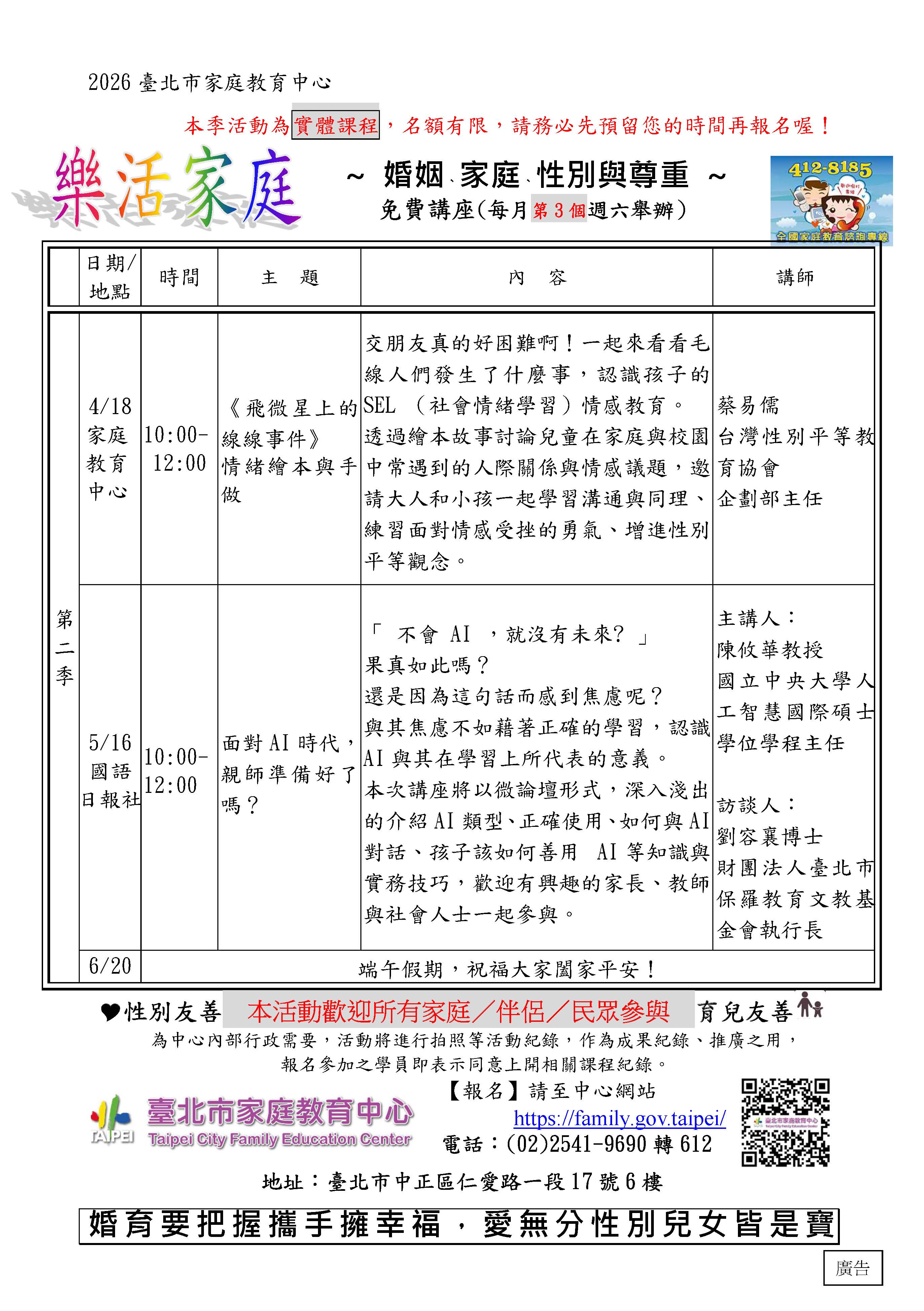 講座開放報名且參加之公務人員及教師可申請終身學習 (研習)時數每場次2小時,活動訊息可於本中心網站 (https://family.gov.taipei/)瀏覽、下載。