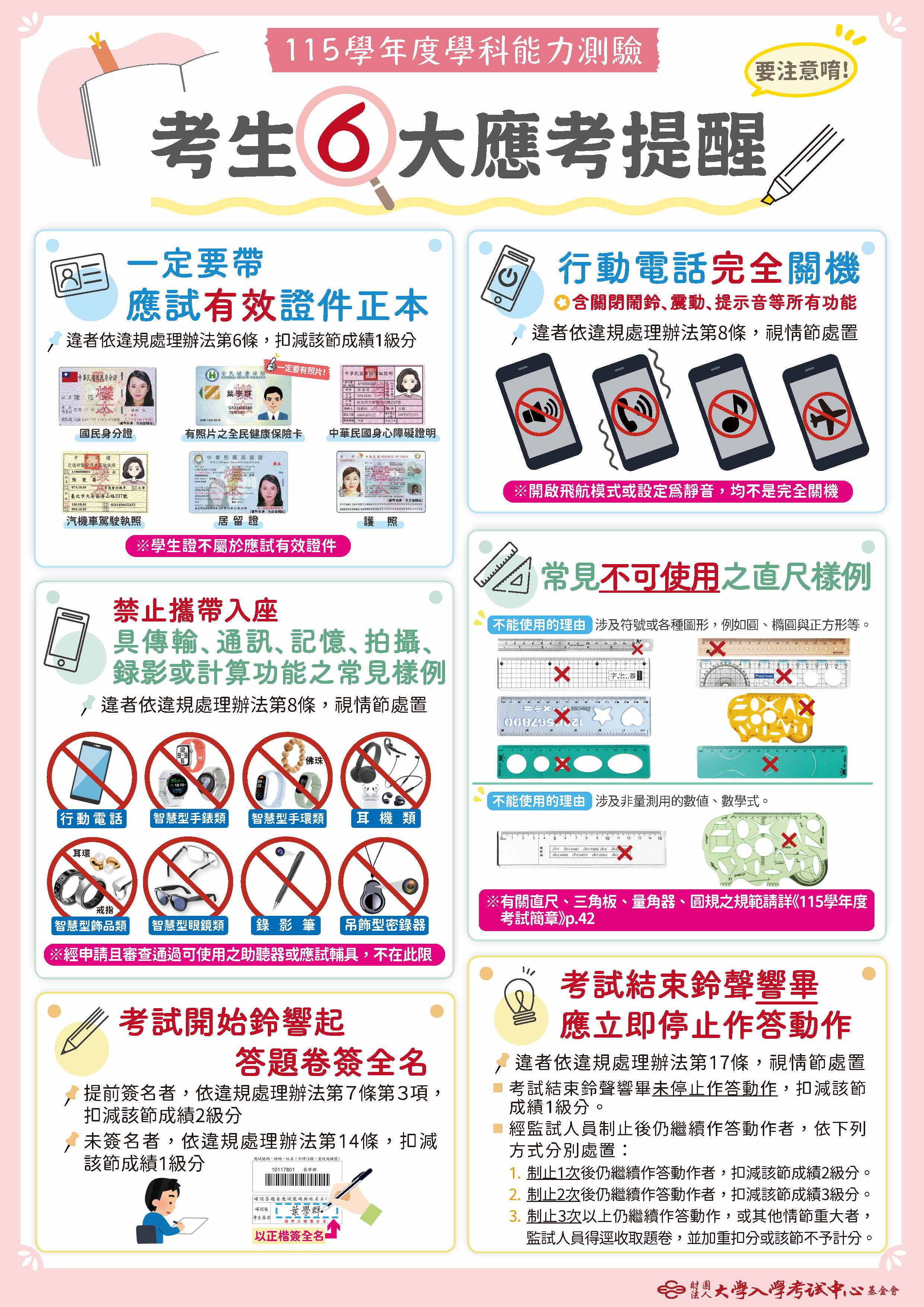 一、請考生務必於 1 月 6 日(二)起至大考中心網站(https://www.ceec.edu.tw)學科能力測驗「試務專區」上網查詢個人應考資訊,包括應試號碼、確切考試地點等資訊。
