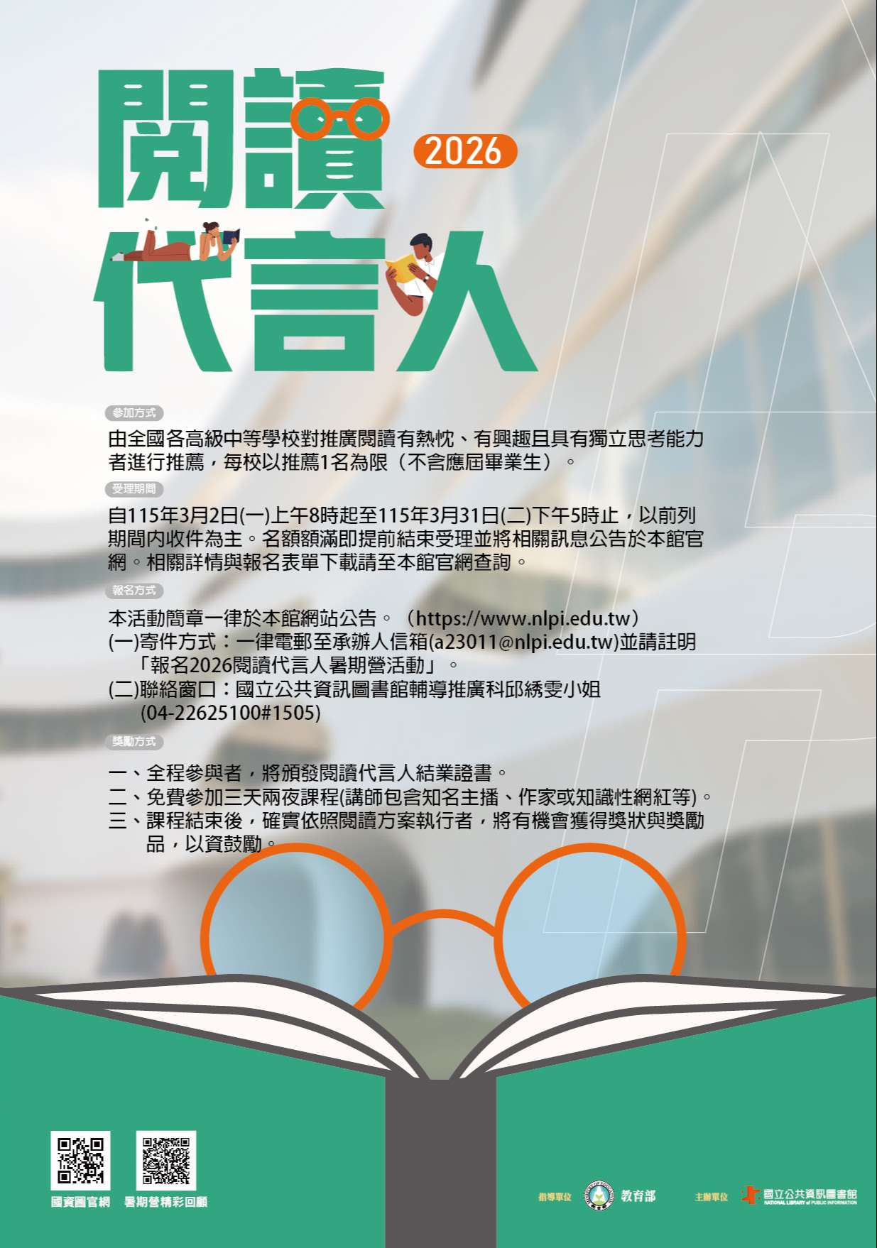 (一)國立公共資訊圖書館辨理2026「閱讀代言人」暑期營活動,徵選學生參加。