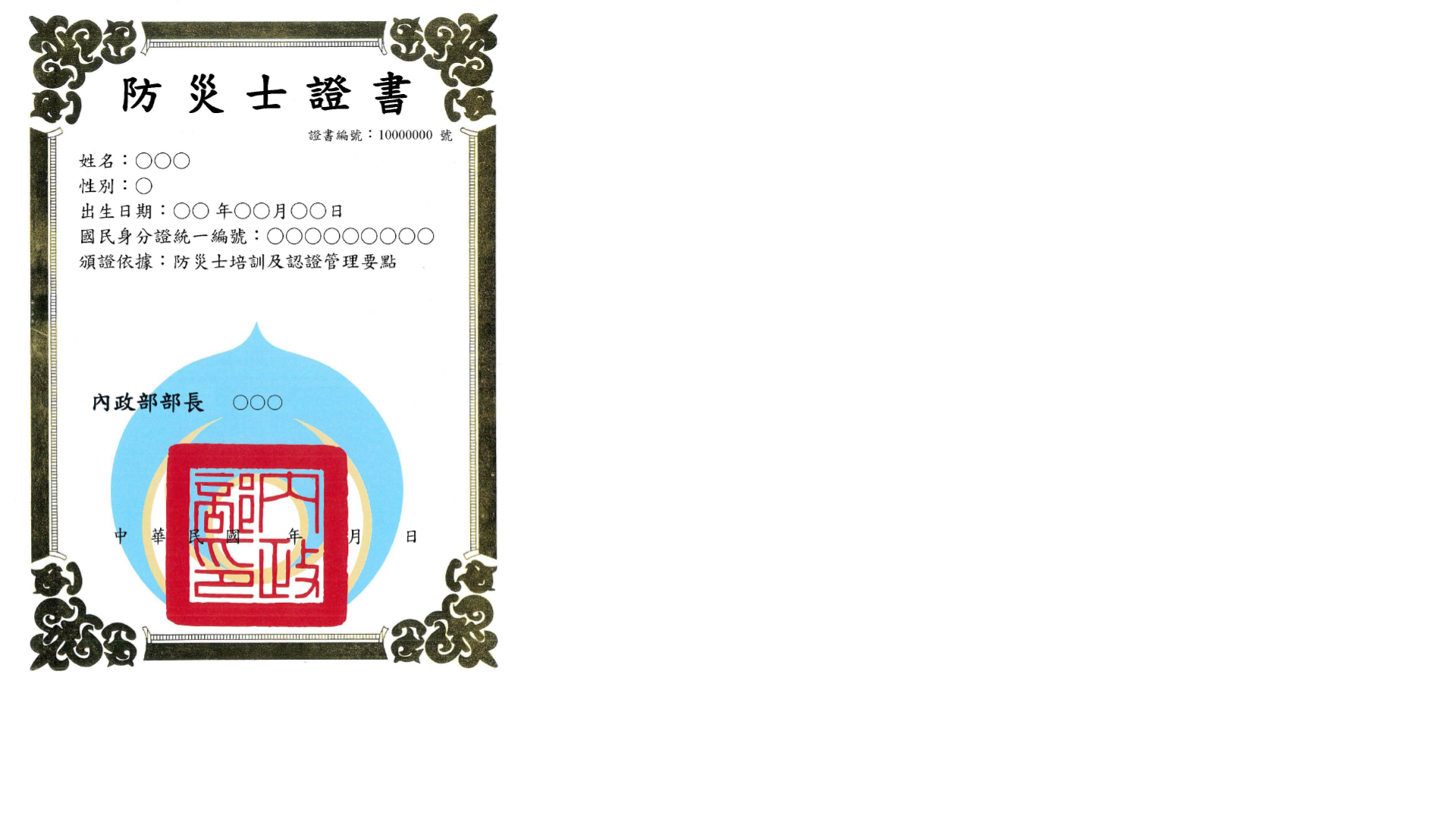 二、全程參與且術科及學科測驗通過即可取得防災士證書及識別證。